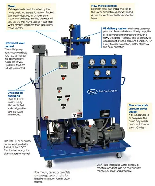 The Pall HLP6 purifier has a newly redesigned vacuum tower which allows for very efficient water removal. It is designed to remove 100% of free gases and water (under steady state conditions), and up to 80% of dissolved gases and water. It is also designed to remove solid contaminants, with efficiency of 99.9% (down to 3 microns).
