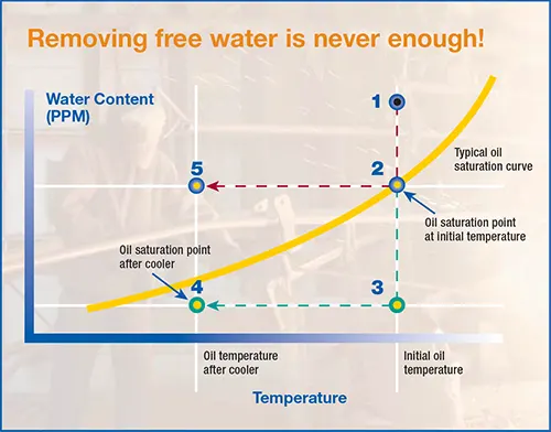 In a typical oil system, temperature swings constantly change the dissolved water content of the oil. At the reservoir location it is critical to remove not only free water, but also a large portion of dissolved water. This is the only way to ensure that free water will not appear when the fluid goes through the cool parts of the system, especially when an oil cooler is used downstream of the reservoir.