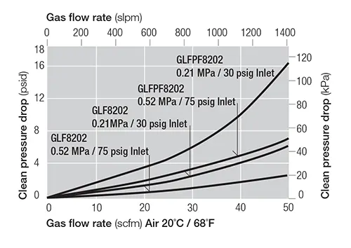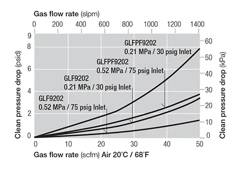 The Maxi Gaskleen filter assembly is specifically designed for ≥ 1.5 nanometer (0.0015 μm) filtration of high flow applications. The 8202 Series assembly is designed for flow rates up to 30 scfm / 850 slpm; the 9202 Series assembly handles flow rates up to 50 scfm / 1416 slpm.